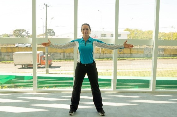 PI: Pés afastados e braços abertos na linha dos ombros.