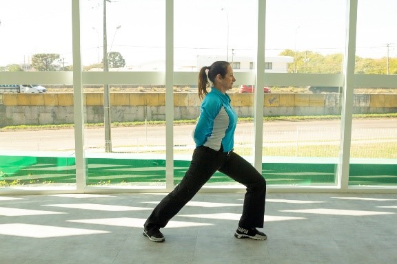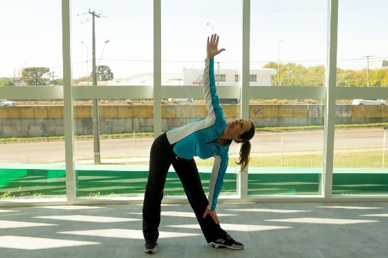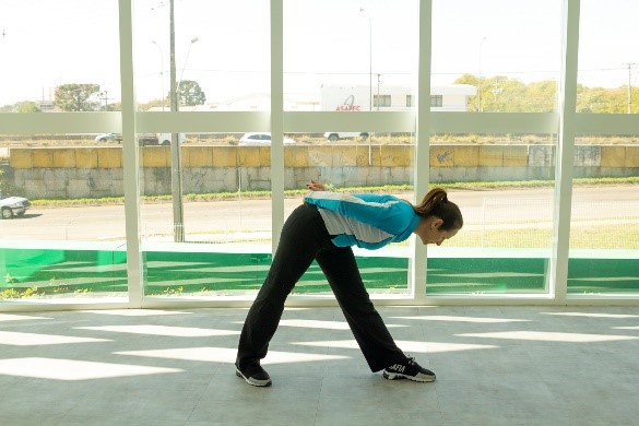 PI: Pés na mesma posição. Agora, manter o tronco flexionado à direita, com a mão direita próxima à perna. O braço esquerdo para o alto.