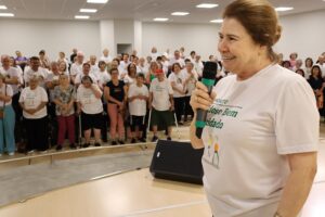 Ao fim das apresentações, os artistas e o público participaram de uma aula de alongamento, que reforçou a necessidade da atividade física para a manutenção da qualidade de vida da população 60+.